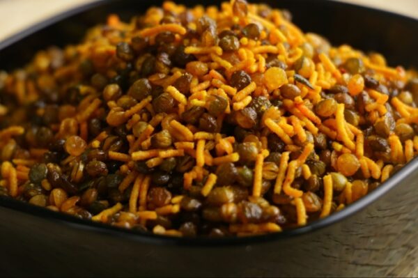 Dal Mot is a savory snack made from lentils, fried and tossed with spices, offering a crunchy texture and a spicy kick, perfect for munching on the go.