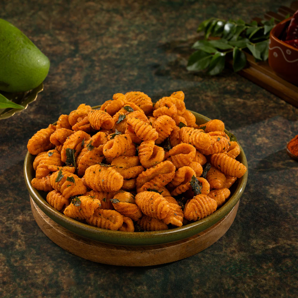 A crispy, shell-shaped Telugu snacks, perfectly spiced and fried for a flavorful crunch in every bite.