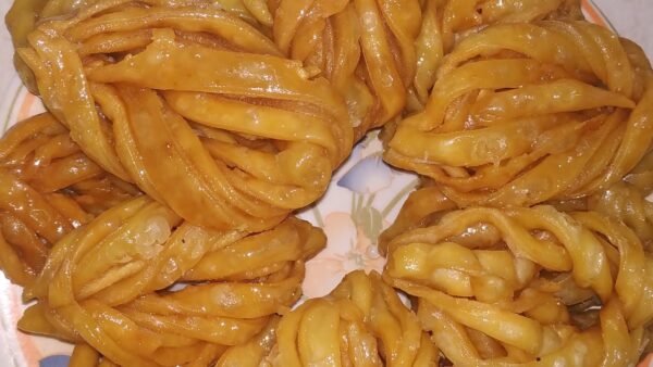This is a very simple and easy to make sweet in which a poori is made out of the dough,cut and shaped into a jackfruit bulb.Then it is deep fried in the oil and dipped in the sugar syrup.